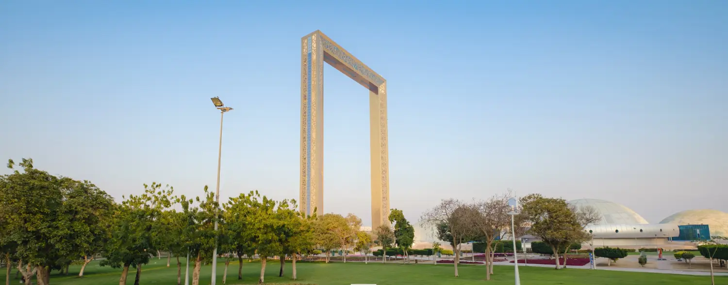 The Dubai Frame is a stunning architectural landmark located in Zabeel Park, Dubai. Standing at 150 meters tall, the structure resembles a giant picture frame, framing picturesque views of both old and new Dubai. With its glass-floored Sky Deck providing panoramic views of the city's iconic skyline, and an immersive museum showcasing the city's transformation