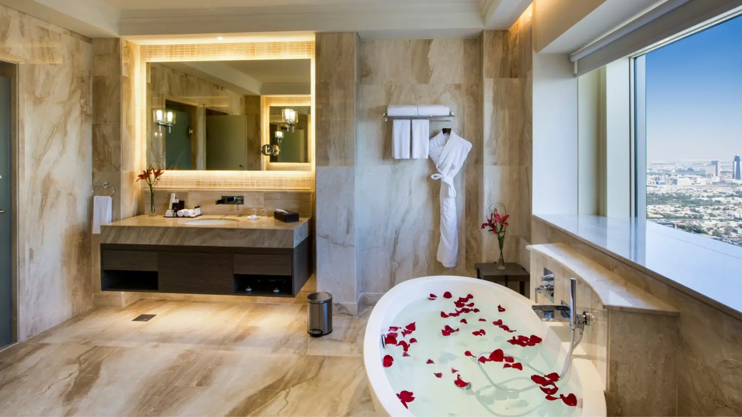 Spanning a generous 34 square meters, provide the perfect retreat with the choice of a king or twin-size bed. Immerse yourself in comfort and convenience with a range of fantastic amenities, including a well-stocked minibar and a tea and coffee-making facility. Stay connected to your busy schedule with complimentary wireless internet access, unwind while catching up on your favorite sitcom on the in-room television, or simply relax and soak in the stunning views that overlook Zabeel Palace, Dubai Creek, and Jumeirah Beach. The bathroom is equipped with a walk-in shower and a bathtub, complete with complimentary toiletries and a hairdryer for your comfort.