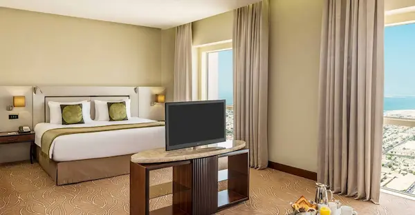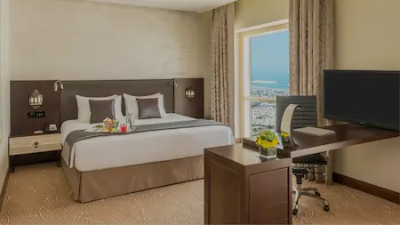 Discover our modern, fully air-conditioned Sky Superior Rooms, boasting 34 square meters of elegant space. Located on the hotel's highest floors, these rooms offer a choice of king- or twin-sized beds and provide a splendid panoramic view of the Dubai Skyline, the azure Gulf and the charming Old Dubai. Stay connected with complimentary Wi-Fi and enjoy the comfort of a cozy sitting area, a 42" LED TV, Tea and Coffee amenities, a Safety Box, and a Mini Bar. The bathroom features both a walk-in shower and a bathtub, complete with free toiletries and a hairdryer, ensuring your stay is both luxurious and convenient.