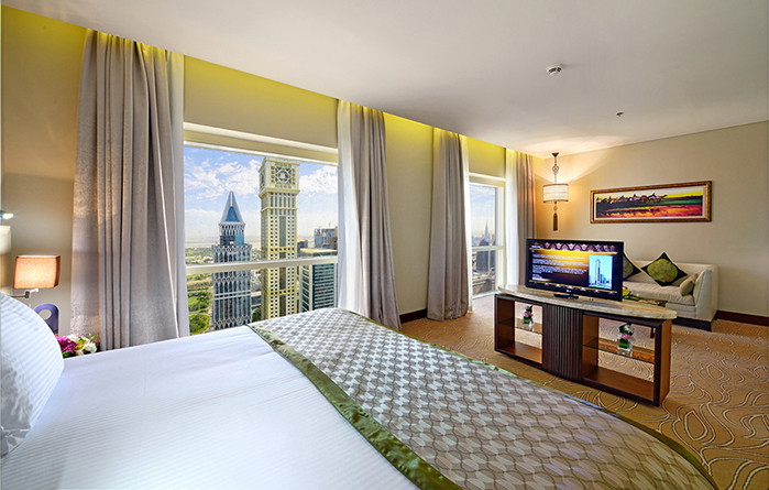 Experience the sensation of living in the sky within our expansive Sky Premium Rooms, covering a generous 48 square meters of fully air-conditioned space. Nestled on the highest floors, these rooms offer a choice between king or twin-sized beds and boast exquisite panoramic views overlooking Zabeel Palace, Dubai Creek, and Jumeirah Beach. Each room features a comfortable sitting area and a dedicated work station, along with modern amenities such as complimentary Wi-Fi, a 42" LED TV, an electric kettle, Tea and Coffee amenities, a Safety Box, and a Mini Bar. The lavish marble-floored bathroom is equipped with both a walk-in shower and a bathtub, complete with complimentary toiletries and a hairdryer.