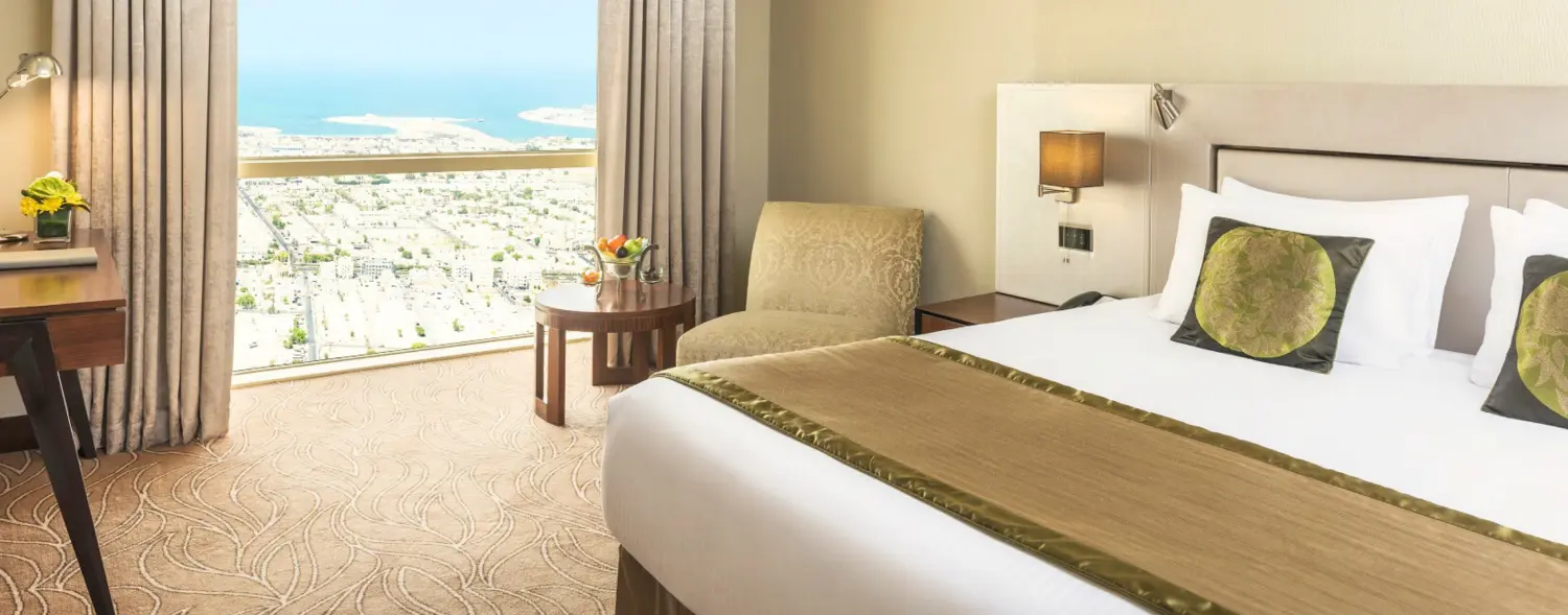 Discover our modern, fully air-conditioned Sky Superior Rooms, boasting 34 square meters of elegant space. Located on the hotel's highest floors, these rooms offer a choice of king- or twin-sized beds and provide a splendid panoramic view of the Dubai Skyline, the azure Gulf and the charming Old Dubai. Stay connected with complimentary Wi-Fi and enjoy the comfort of a cozy sitting area, a 42" LED TV, Tea and Coffee amenities, a Safety Box, and a Mini Bar. The bathroom features both a walk-in shower and a bathtub, complete with free toiletries and a hairdryer, ensuring your stay is both luxurious and convenient.