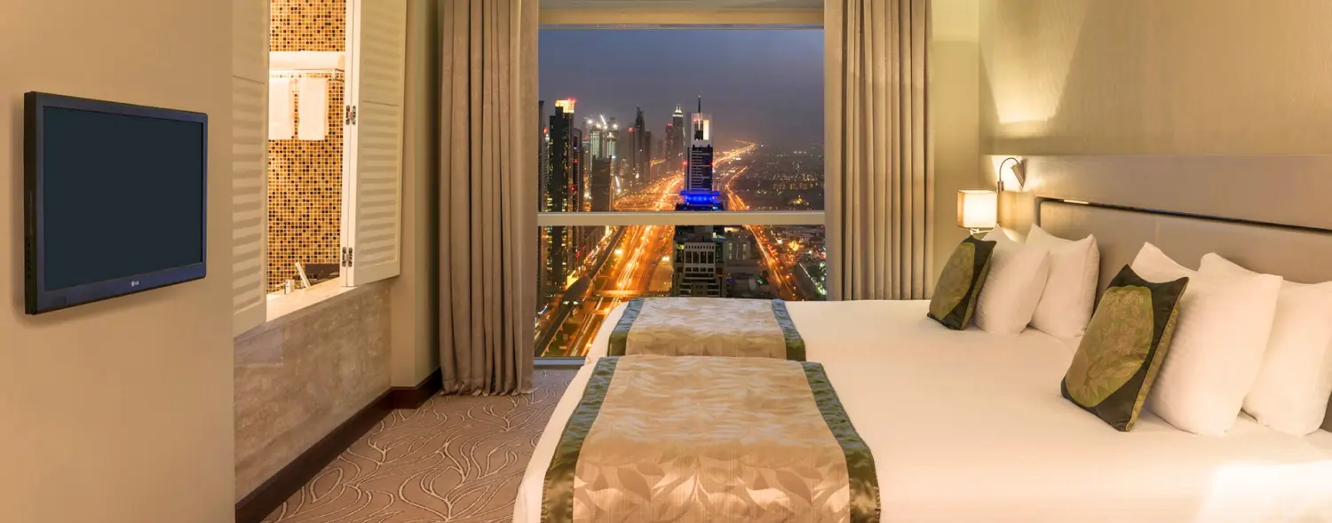 Spanning a generous 34 square meters, provide the perfect retreat with the choice of a king or twin-size bed. Immerse yourself in comfort and convenience with a range of fantastic amenities, including a well-stocked minibar and a tea and coffee-making facility. Stay connected to your busy schedule with complimentary wireless internet access, unwind while catching up on your favorite sitcom on the in-room television, or simply relax and soak in the stunning views that overlook Zabeel Palace, Dubai Creek, and Jumeirah Beach. The bathroom is equipped with a walk-in shower and a bathtub, complete with complimentary toiletries and a hairdryer for your comfort.